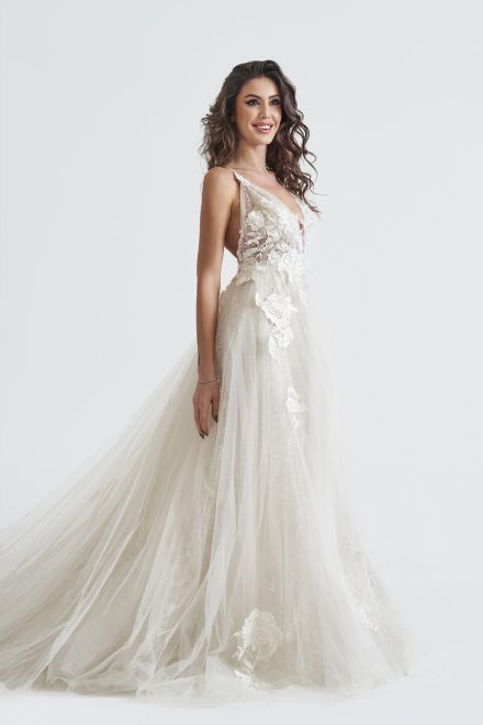 Product Features | Thin straps V-neckline Back decollete Silvery fabric Long train Can be embellished with a tarlatan |