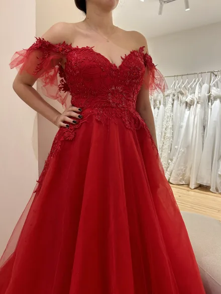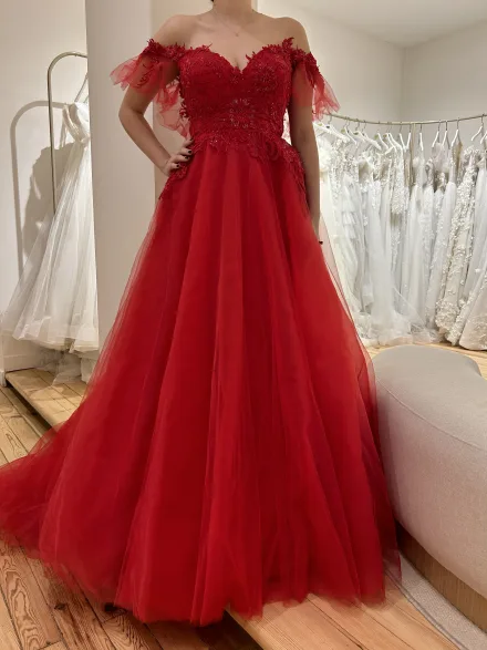 Product Specifications A-line cut (with tarlatan), Side low sleeves, Cross-string lace-up back