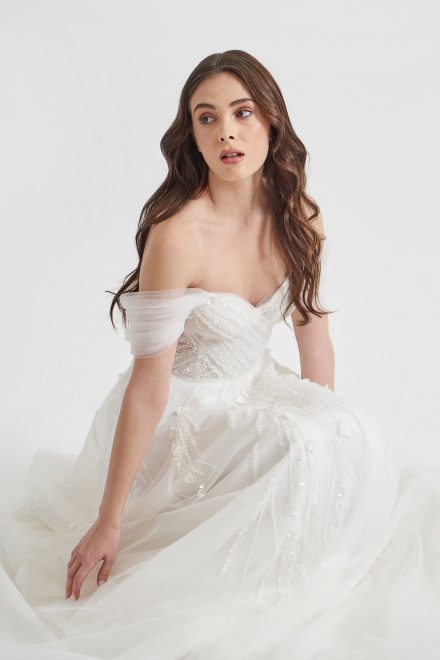 Product Features | Low tulle sleeves Sparkling A-line train |