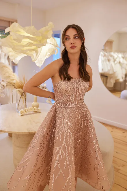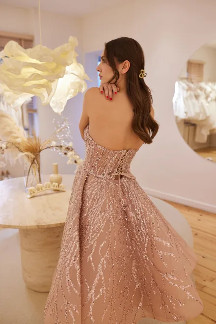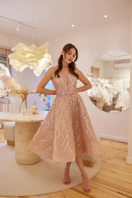 Product Specifications Strapless, bell skirt, lace-up back, midi length