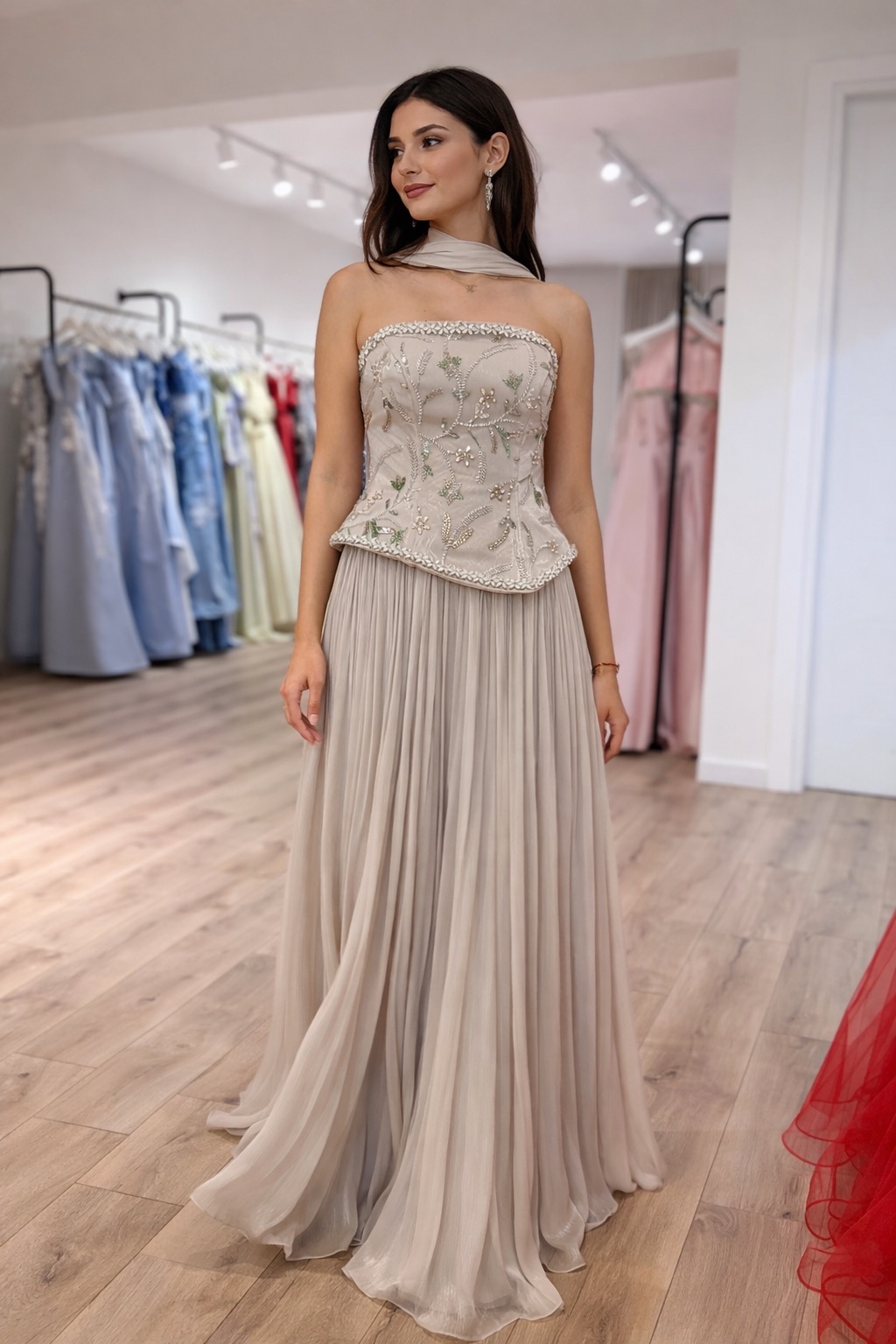 Korsesi taş detaylı , pilise etekli elbise