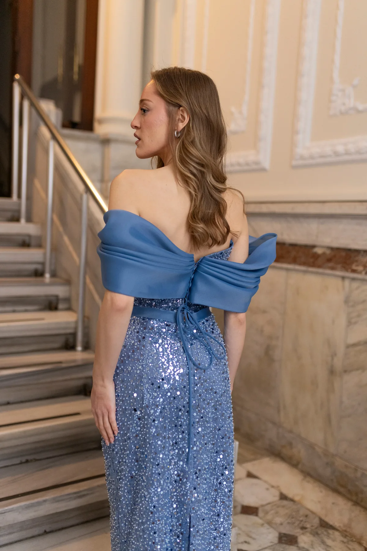 Ürün Özellikleri Düşük organze kol detaylı Balenli üst beden Işıltılı payet kumaş Sırtı çapraz ip bağcıklı Midi boy