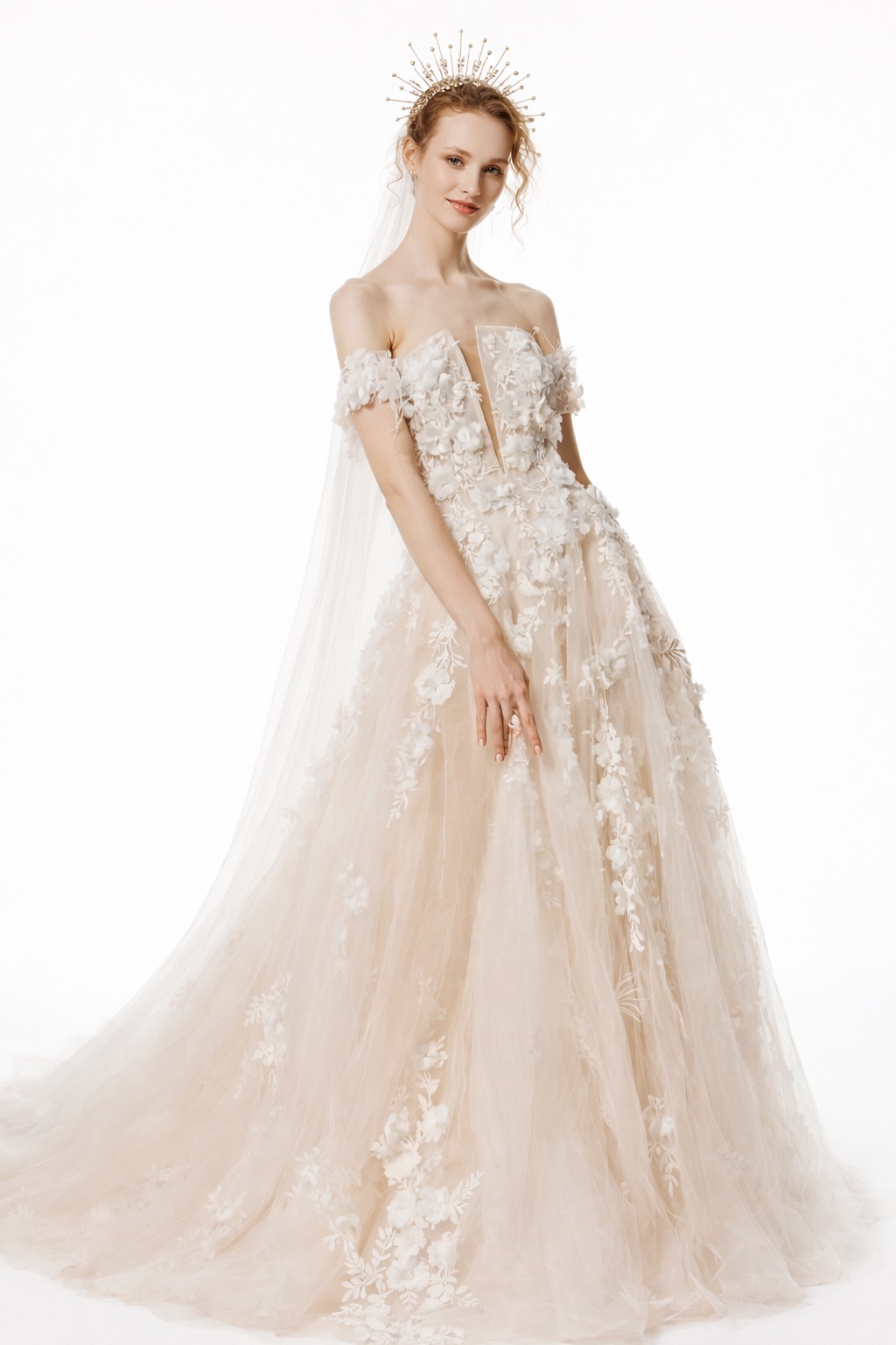 Vakko Wedding markasına ait üzeri 3d çiçekli ,yoğun tüllü gelinlik