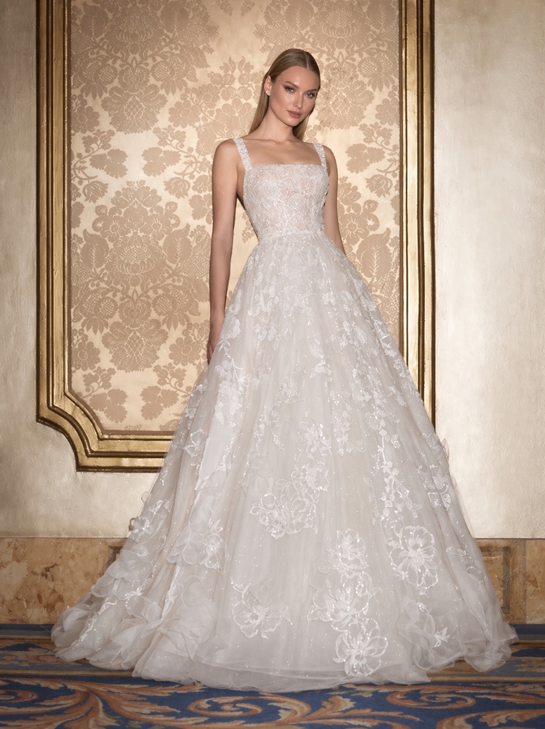Vakko Wedding markasına ait , kare yakalı ışıltılı yeni sezon gelinlik
