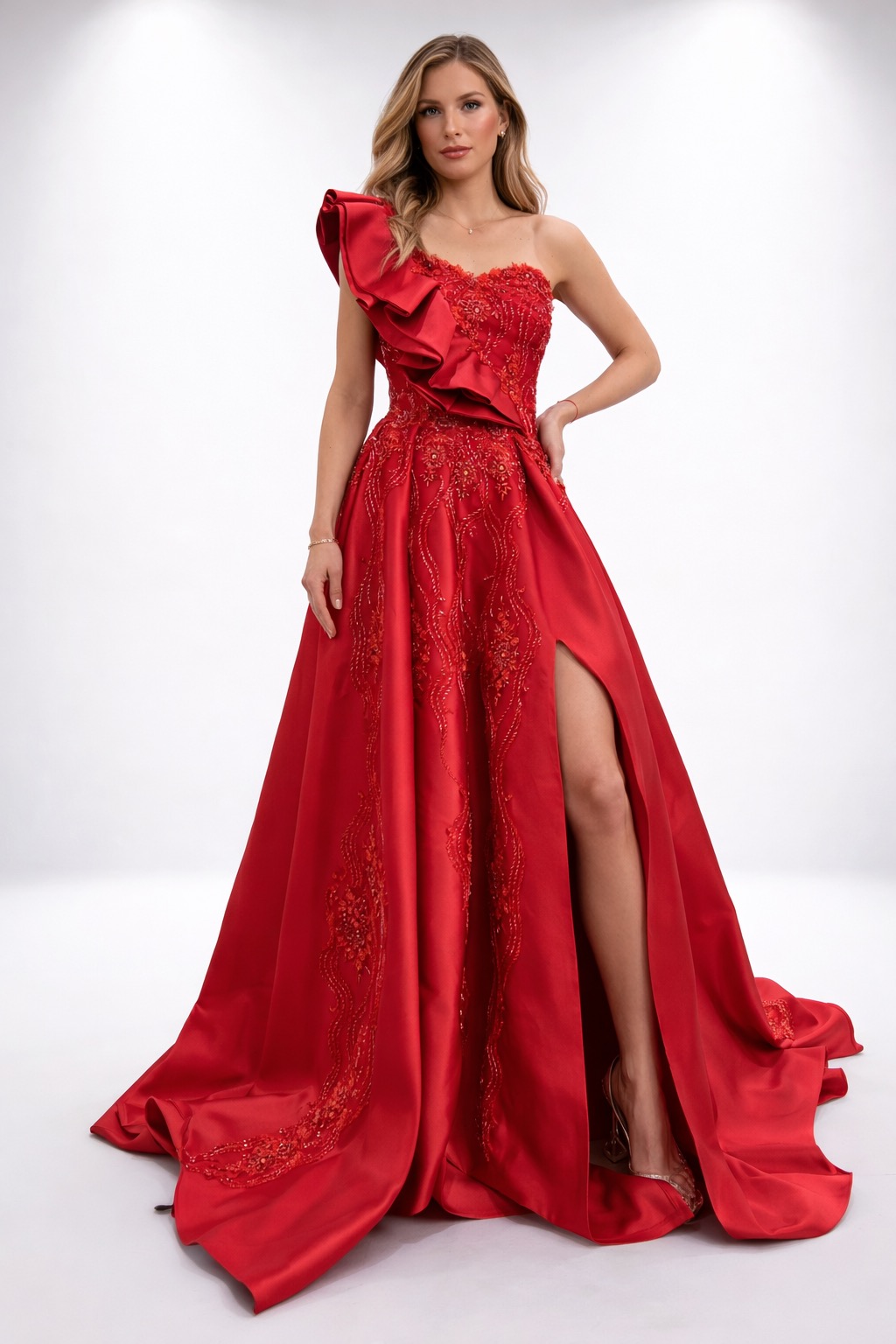 Üzeri işlemeli , tek omuzu saten volan detaylı , yırtmaçlı kiralık kına elbisesi Rent is the new chic te.