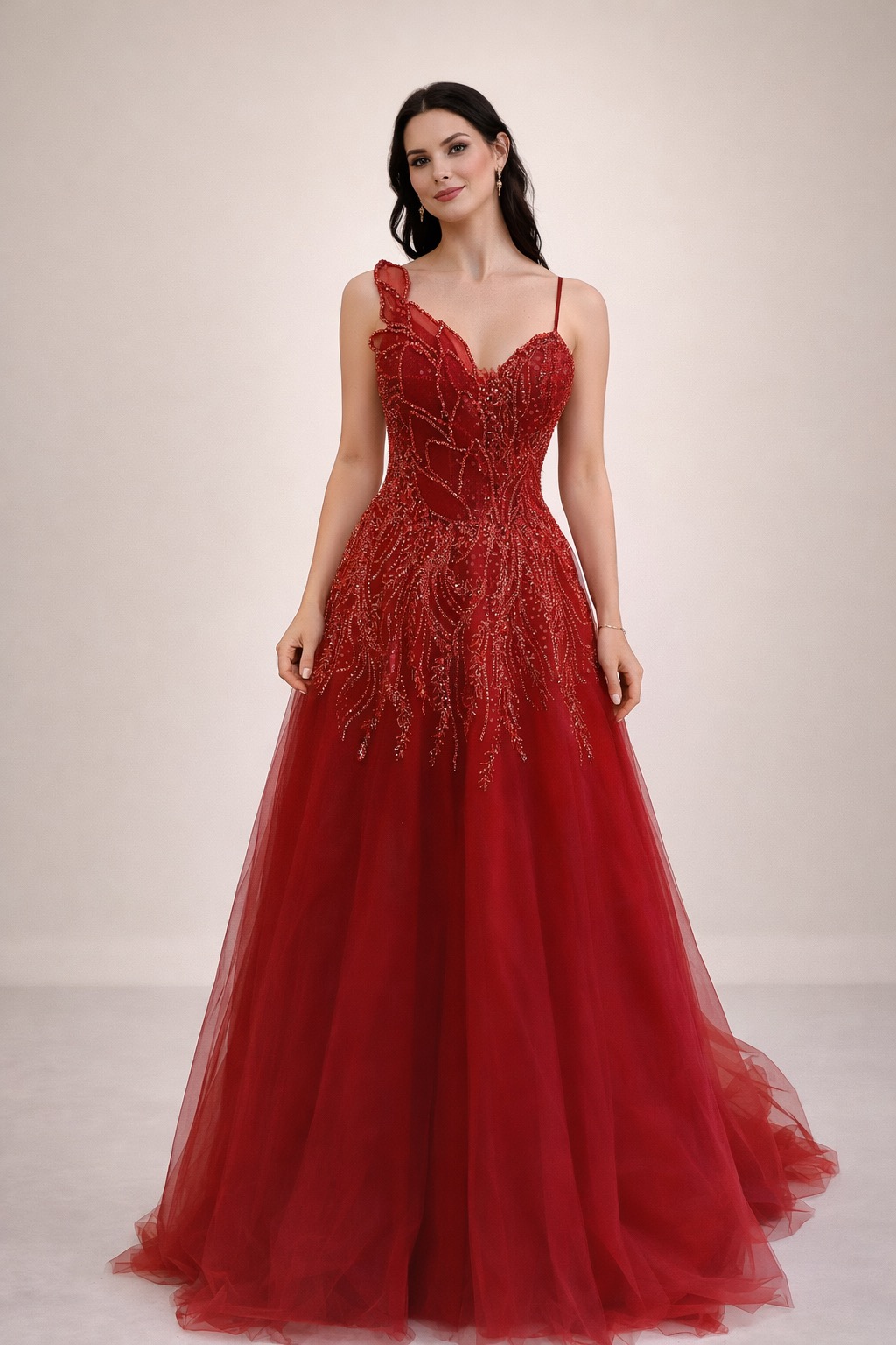 Üzeri ışıltılı taş işlemeli ,3d yaprak motifli kırmızı kına elbisesi